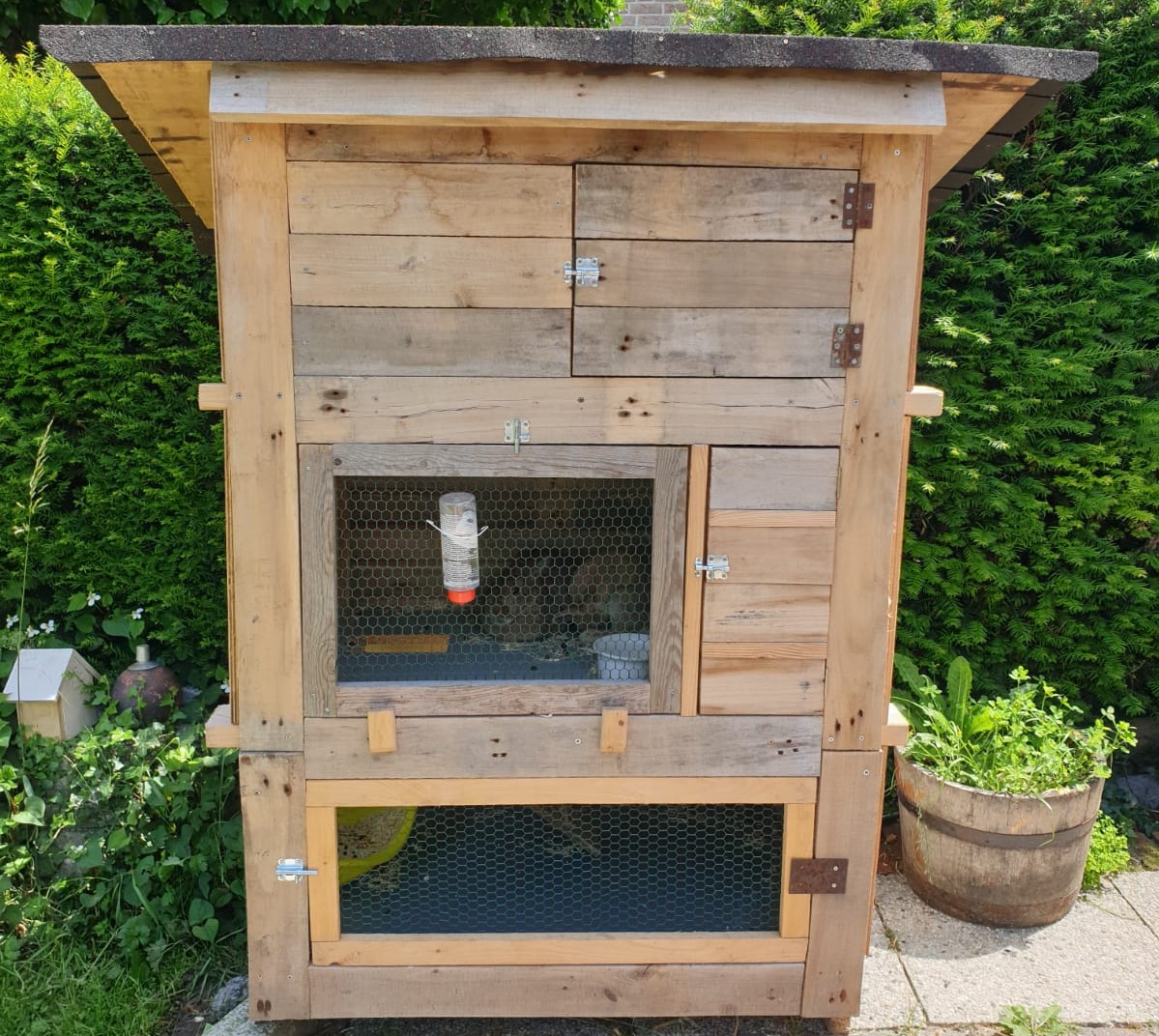 het hok wordt zoveel mogelijk gemaakt van hergebruikt hout en materialen, zo bestaat het voornamelijk uit pallet hout. zo is het beter voor het milieu en kost het mij niet te veel.